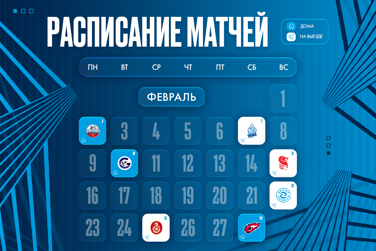 Ближайший матч – против «Ярославича» 2 февраля, игра пройдет в Академии Платонова, после чего команда Владимира Алекно отправится в Уфу, где 7 февраля сыграет с ВК «Динамо-Урал». 10 февраля петербуржцы в Академии Платонова проведут встречу против «Газпром-Югры», а сразу после этого сине-бело-голубым предстоят 2 выезда в Тулу, где 15 февраля они сыграют с «Белогорьем», и в столицу Татарстана, где 22 февраля сыграют против лидера чемпионата, казанского «Зенита». Выездная серия продолжится встречей в Оренбурге, где 25-го февраля зенитовцев ожидает встреча против ВК «Оренбуржье». Закончится заключительный зимний месяц домашней встречей – 28 февраля в КСК «Арена» «Зенит» сыграет с новоуренгойским ВК «Факел Ямал».