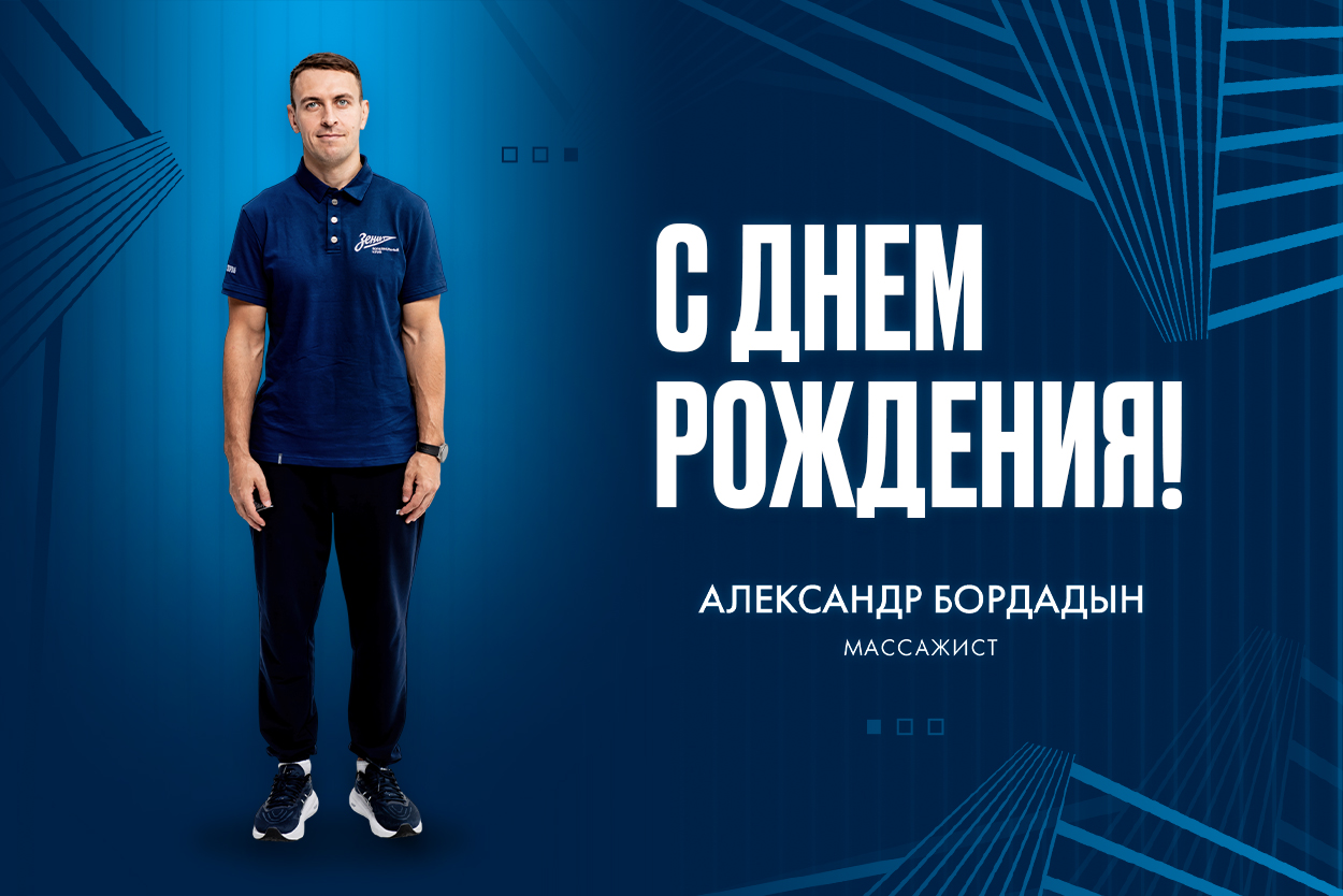 03 февраля свой день рождения отмечает массажист команды «Зенит» (Санкт-Петербург) Бордадын Александр. Удачи, здоровья, счастья и, конечно, новых побед! С праздником!