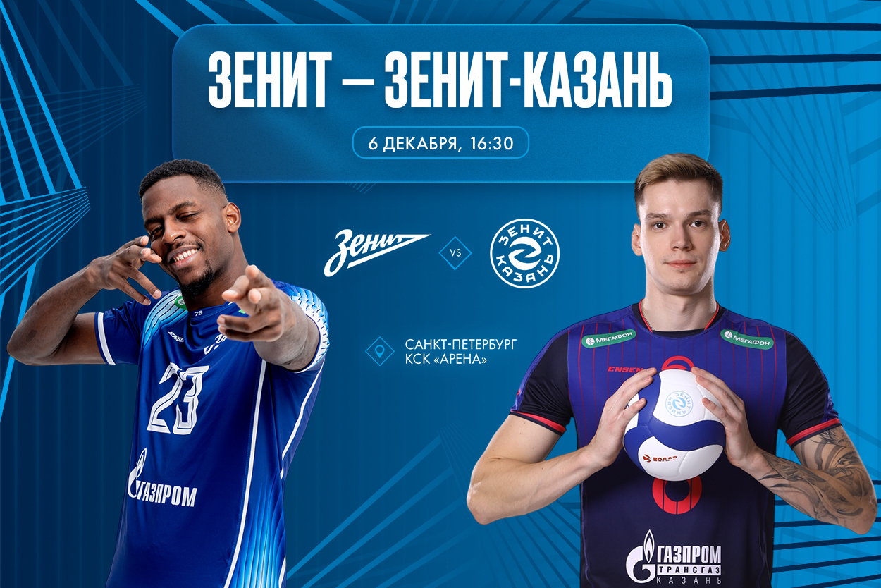 Матч «Зенит» — «Зенит-Казань» начнется завтра, 6 декабря в КСК «Арена» в 16.30. Если вы вдруг не сможете попасть на игру, поболеть за сине-бело-голубых можно на телеканалах «Матч!Игра», «Волейбол», нашем сайте и volley.ru.