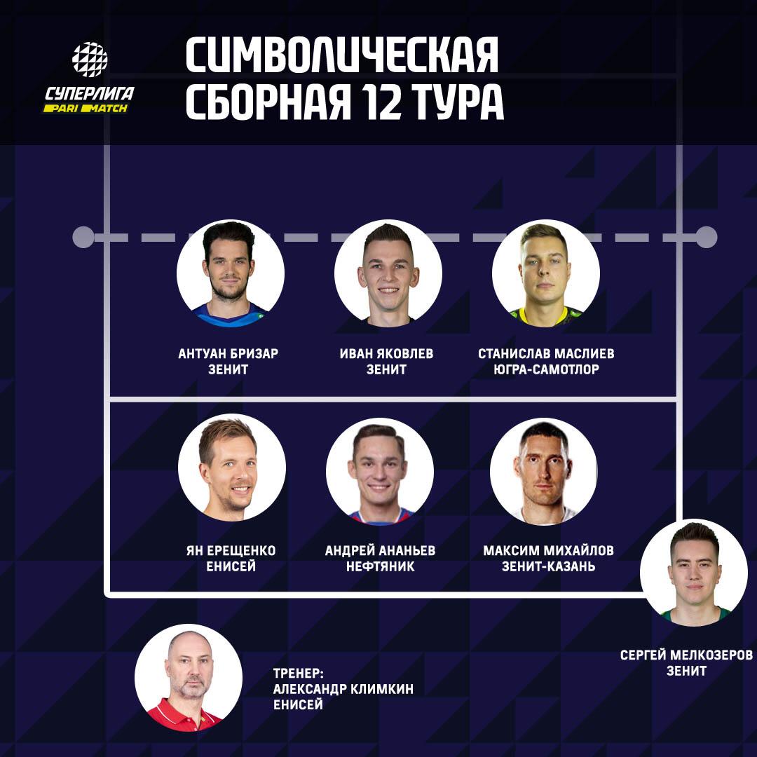 Сразу трое игроков «Зенита» (Санкт-Петербург) вошли в составляемую ВФВ символическую сборную 12-го тура чемпионата России Суперлига Париматч — центральный блокирующий Иван Яковлев, связующий Антуан Бризар и либеро Сергей Мелкозеров.