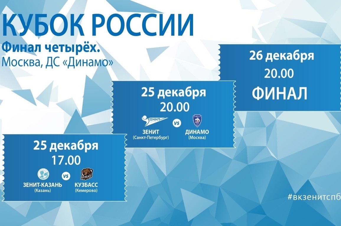 25 декабря в 20.00 «Зенит» (Санкт-Петербург) встретится с организатором турнира – «Динамо» (Москва). На данный момент столичный клуб возглавляет турнирную таблицу чемпионата России, одержав 5 побед в 5 матчах.