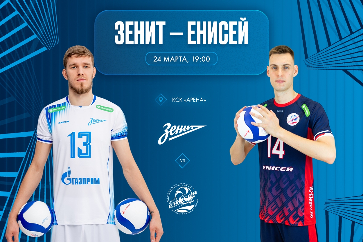 Матч «Зенит» — «Енисей» начнется завтра, 24-го марта, в 19.00 в КСК «Арена», купить билеты можно ЗДЕСЬ! А если вы не сможете попасть на матч, то поболеть за сине-бело-голубых можно на телеканале «Матч! Страна», нашем сайте и volley.ru.
