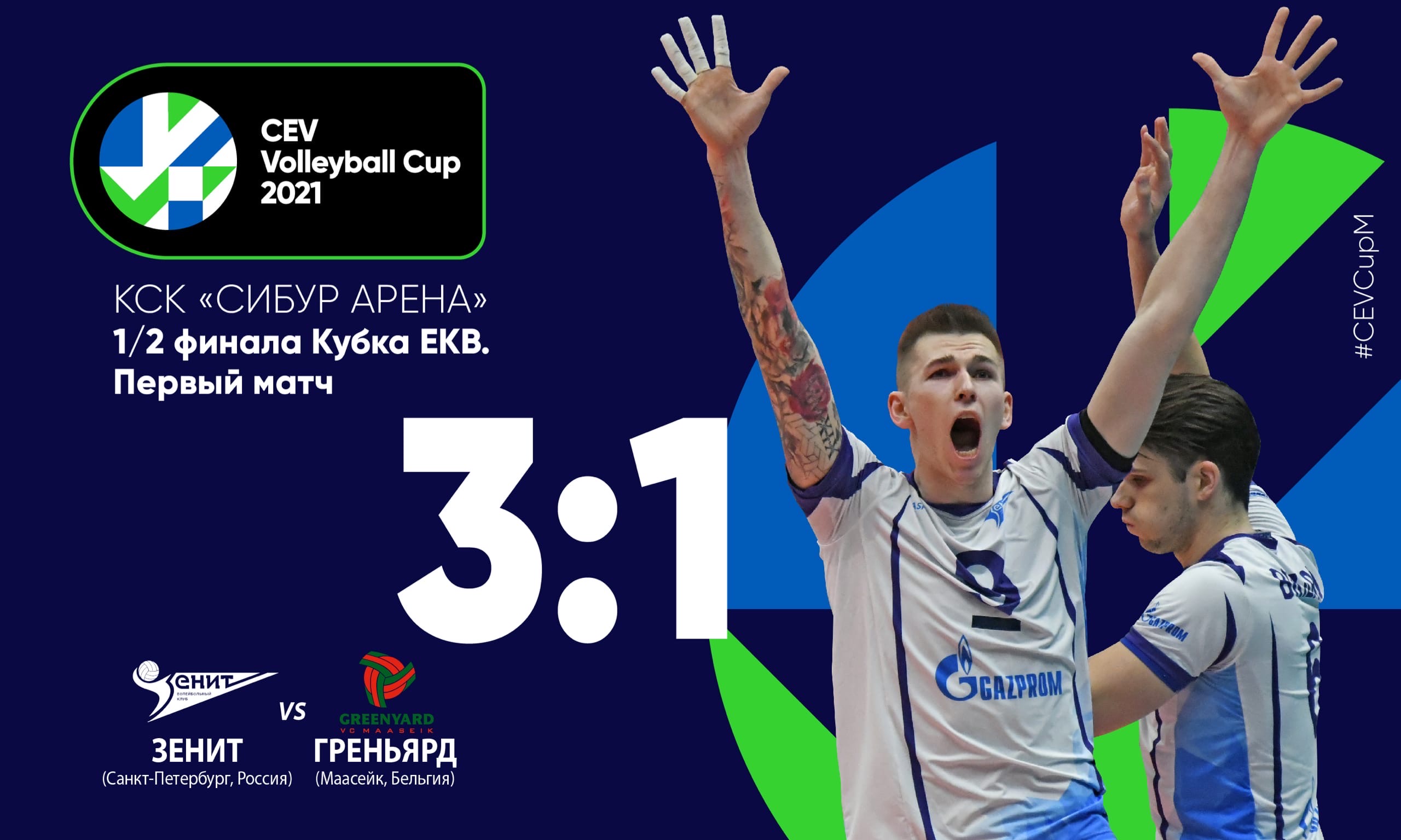 В трудном и драматичном матче «Зенит» (Санкт-Петербург) на своей площадке обыграл бельгийский «Греньярд» в первой игре полуфинала Кубка ЕКВ. Ответная игра состоится 3 марта. Для выхода в финал петербургской команде достаточно выиграть две партии.