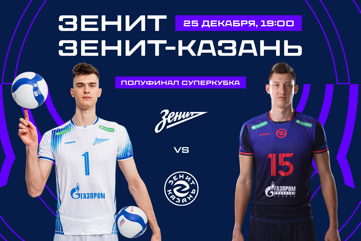 Полуфинальный матч Суперкубка России «Зенит» — «Зенит-Казань» начнется завтра, 25 декабря, в КСК «Арена» в 19.00, билеты можно приобрести ЗДЕСЬ! Если вы вдруг не сможете попасть на игру, поболеть за сине-бело-голубых можно на телеканалах «МатчТВ», «Волейбол», нашем сайте и volley.ru.