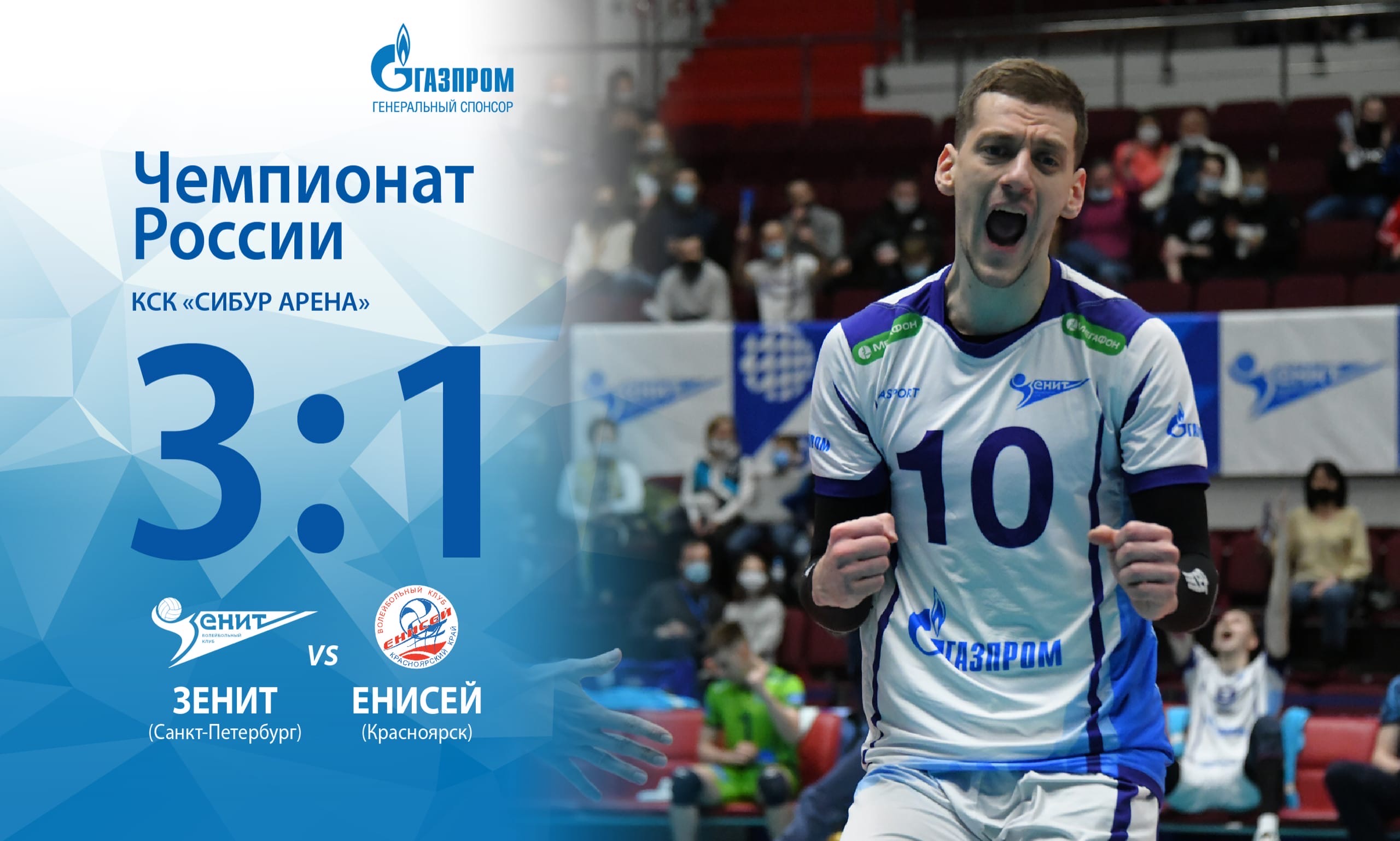 В матче 24-го тура чемпионата России Суперлига Париматч «Зенит» (Санкт-Петербург) в КСК «СИБУР АРЕНА» переиграл красноярский «Енисей» — 3:1.