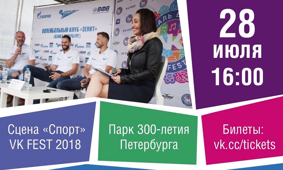 28 июля в рамках встречи с болельщиками на фестивале VK Fest 2018 будет объявлено имя последнего новичка волейбольного клуба «Зенит» (Санкт-Петербург) в межсезонье. Мероприятие начнется в 16.00 на сцене «Спорт». Помимо объявления итогового состава на предстоящий сезон, главный тренер команды Александр Климкин вместе с игроками Александром Волковым и Евгением Сивожелезом разыграют призы для болельщиков, ответят на их вопросы и примут участие в автограф- и фотосессии. Также в программе — выступления клубной группы поддержки.
