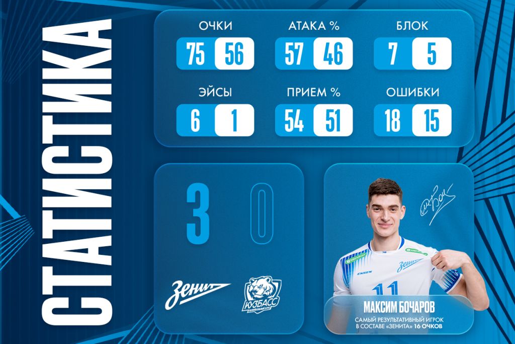Зенит (Санкт-Петербург) — Кузбасс (Кемерово) — 3:0 (25:22,25:20,25:14)