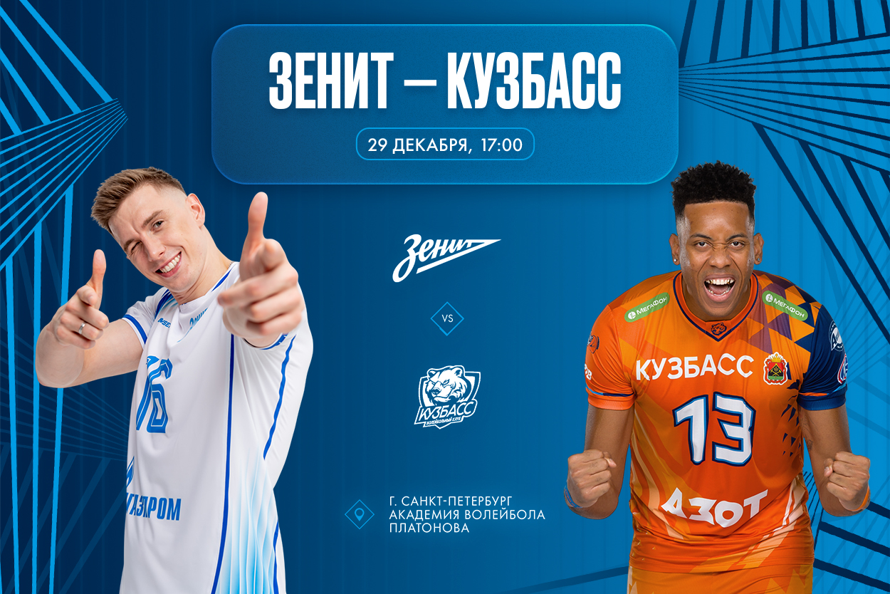 Матч «Зенит» — «Кузбасс» начнется сегодня, 29 декабря, в Академии Платонова в 17.00, билеты можно приобрести ЗДЕСЬ! Если вы вдруг не сможете попасть на игру, поболеть за сине-бело-голубых можно на телеканале «Волейбол», нашем сайте и volley.ru.