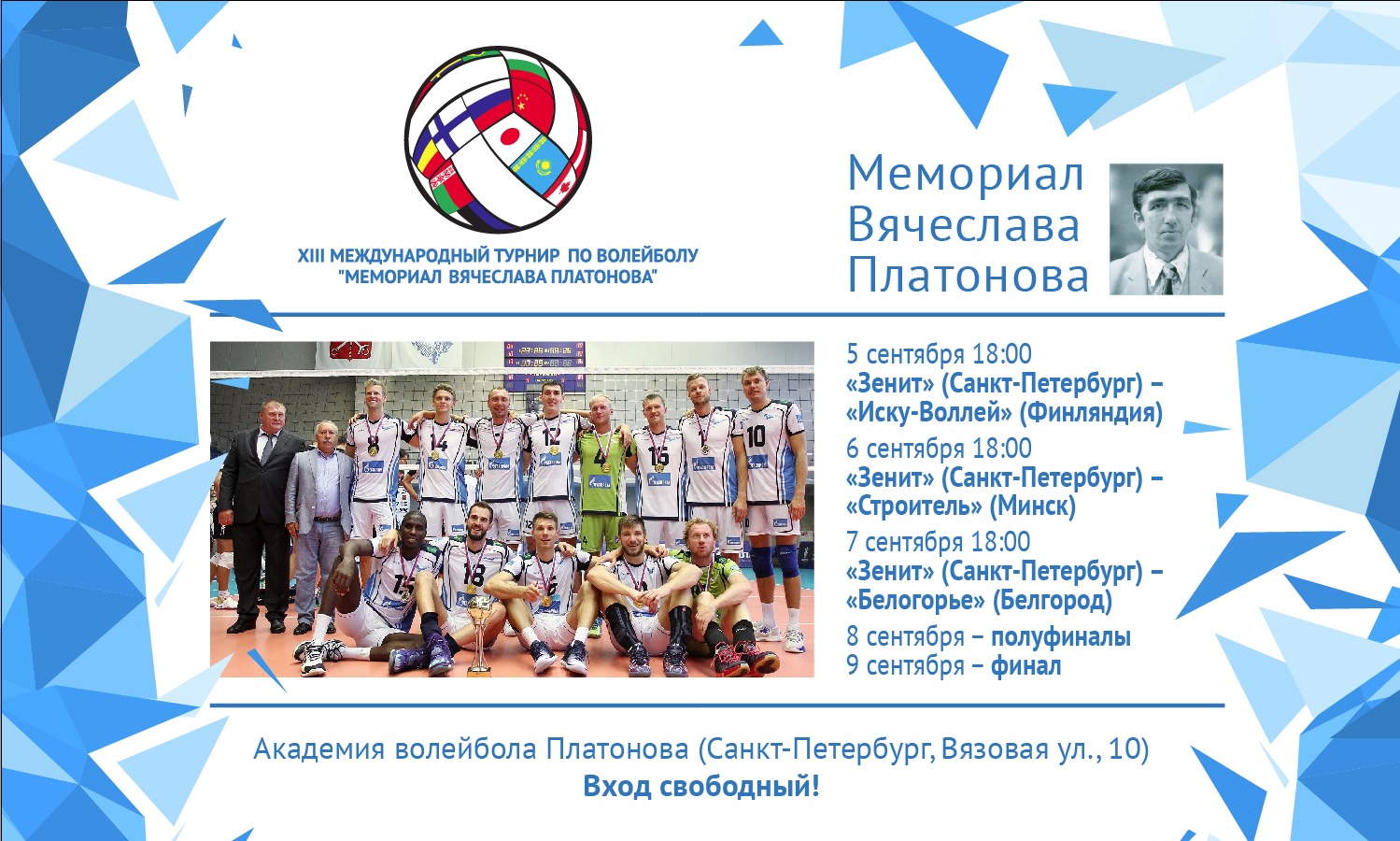 Волейбольный клуб «Зенит» (Санкт-Петербург) приглашает вас на пресс-конференцию, посвященную XIII Международному турниру «Мемориал Вячеслава Платонова». Она состоится 05 сентября в 15.45. в Музее Вячеслава Платонова (второй этаж здания Академии Вячеслава Платонова, ул. Вязовая, 10).