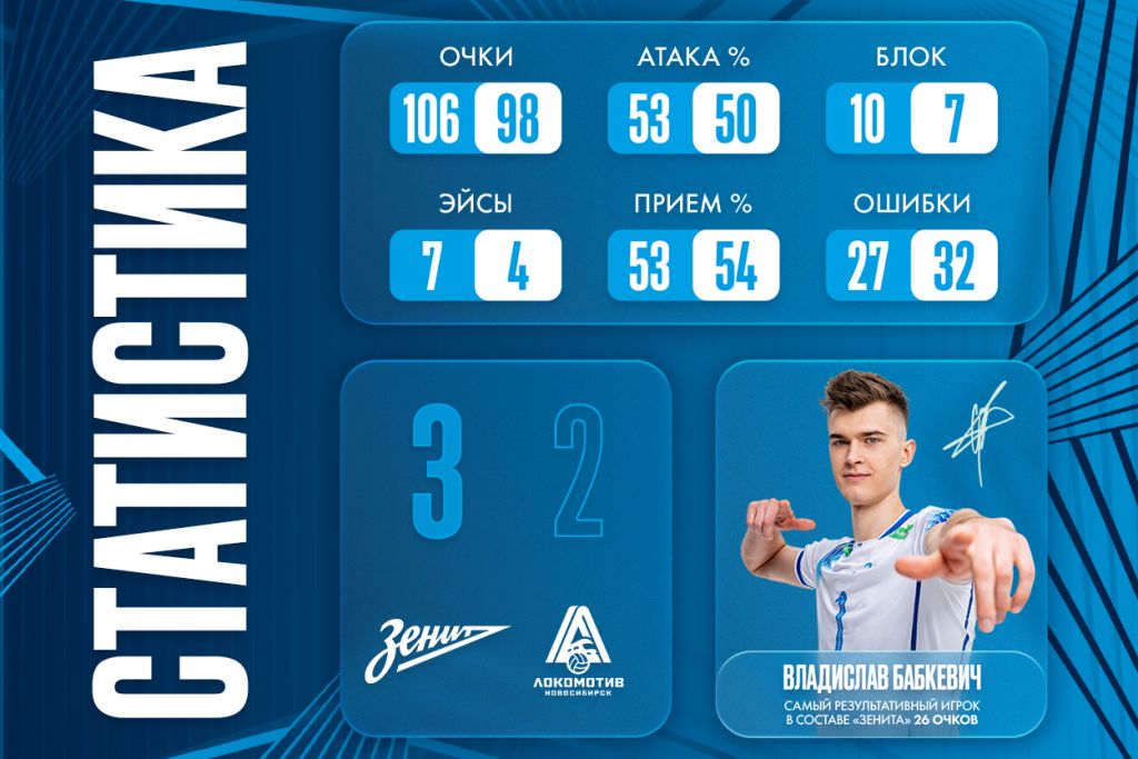 В пятой партии команды продемонстрировали равную игру, но зенитовцы дожали соперника 15:12, сравняв счет в серии. Самым результативным в составе сине-бело-голубых стал Владислав Бабкевич, набравший 26 очков.