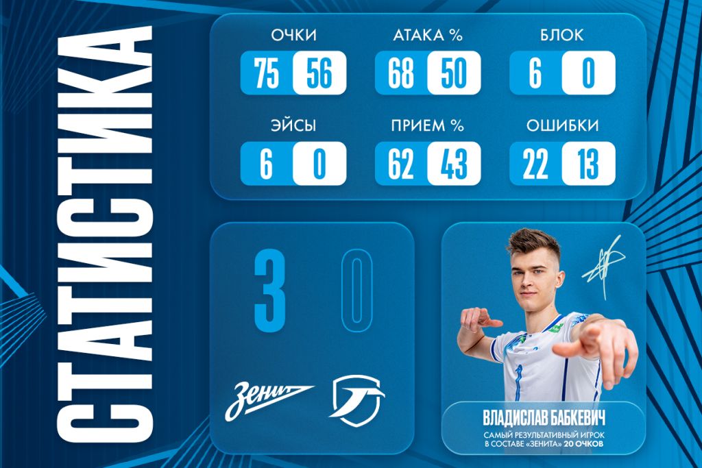 В третьей партии волейболистов «Горького» вновь подвел прием: с 33% они выдали 45% в атаке, в то время как петербуржцы из 72% выжали 62%. Первую ошибку в атаке диагональный «Зенита» Владислав Бабкевич совершил на старте третьей партии (6:7). Но после этого на его же подаче хозяева совершили рывок (11:11 — 14:11). По итогам игры — 6:0 по блокам в пользу «Зенита», а также 6:0 по эйсам. Всё, в чем гости смогли превзойти сине-бело-голубых – количество ошибок на приёме: 11:2. Самым результативным в составе «Зенита» стал Владислав Бабкевич, набравший 20 очков. Следующий матч зенитовцы проведут 27 января в Академии Платонова против красноярского «Енисея».